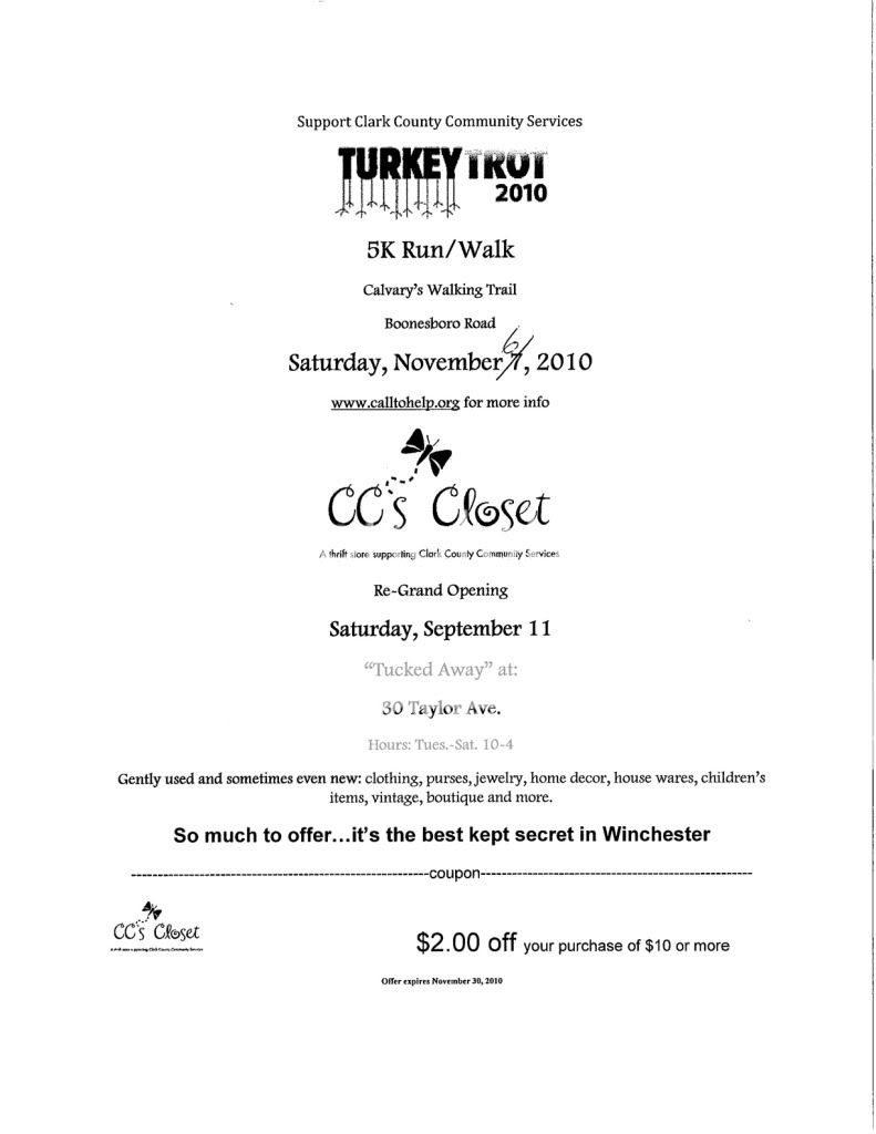 CC's Closet is a Community Thrift Store located in Winchester, Ky. They have been in business for 35 years and have GREAT prices. They just recently renovated and re-opened. In honor of their grand re-opening, They have a new coupon! You can get $2 off your $10 purchase. The coupon expires on November 30th.